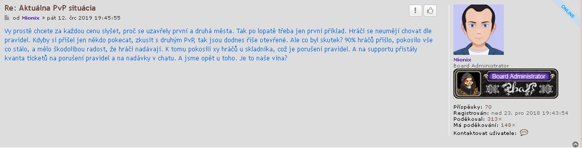 Jako hráč, který hraje Ekuru a metin obecně nějakých 10let, mi přijde naproste "ujeté" nechat uzavřené říše. Od té doby co jsou uzavřené je v modré říší u skladu touhle dobou cca 50lidí, v červené okolo 20 a ve žluté 10. Metin je všeobecně převážně PVP hra a PVM výbavu všichni zakládají, aby se propracovali k té PVP, momentálně jsem měl delší pauzu od Metinu a chtěl bych se na Ekuru vrátit a mám PVM výbavu a rozdělanou PVP, ale když se podívám, od kolika jsou války, tak PVP u mě nemá moc smysl a kvůli PVM se mi to hrát nechce a myslím si, že nejsem jediný, kdo to tak má a proto je Ekura tam, kde se momentálně nachází. Ještě CCA před rokem se taky psalo jak je Ekura na upádku, ale to bylo ve městech okolo 50-70lidí což je o PŮLKU VÍC než je momentálně. Už v jiném tématu jsem narazil, že někdo psal, že ho to obtěžovalo, že ho někdo zabil u skladu..... Já když jsem začínal, tak jsem ty TOP hráče s PVP bral jako vzor a vždycky jsem chtěl být jako oni v té hře a to mě tak nějak táhlo kupředu. Ted si udělám pvp a stejně u skladu SE UŽ moc nebojuje, žádný pořádný cech už na Ekuře není, natož 2, aby se mohla dát nějaká válka a ty války říší prostě nestíhám.