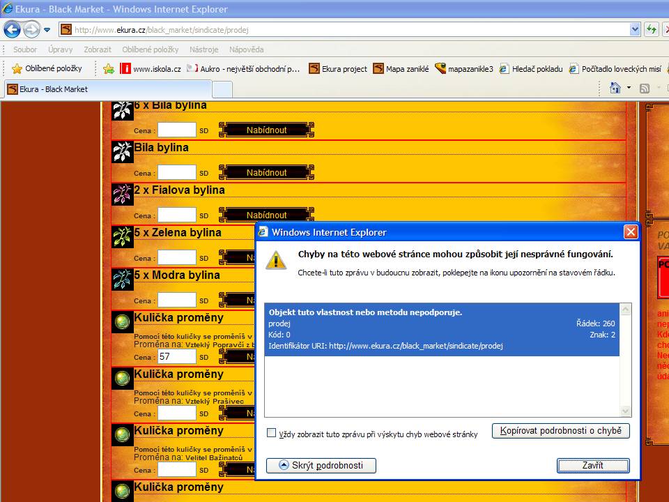 arabela píše:Pokoušela jsem se několikrát vložit předměty na prodej, ale stále mi to hlásí, že na stránce se vyskytla chyba. V levém spodním rohu je žlutý trjúhelník s vykřičníkem.