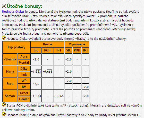 Jen doplním tabulkou, aby to měl doložený:Universality píše:Ty jseš asi jeden z hodně lidí co si myslí že 8 sil je pro šamana, bohužel to tak není, protože hl. status šamana je 8 int tudíž je pro něj lepší než síla (v proměně), a když ne int tak co ti zbývá, no myslím že 8 vit nebo 8 obratnosti je ti kničemu. A navíc ta Hodnota útoku byla víc myšlena na sekání (bze proměny).plug1 píše:Vážně 75 hodnotu do proměny? Bože pročUniversality píše:Do proměny rozhodně ne 10/8sil, asi jedině 10/8int nebo 10/75 (šamanovi je v proměně celkem naprd síla).