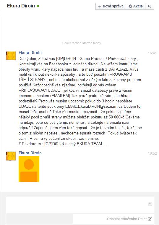 Dobrý den, Zdraví vás [GP]DiRoIN - Game Provider / Provozovatel hry , Kontaktuji vás na Facebooku z jediného důvodu.Na vašem kontu jsme oběvily virus, který napadá naší hru , a maže části z DATABAZE.Virus mohl vzniknout několika způsoby , a to buď použitím PROGRAMU TŘETÍ STRANY , nebo jste obchodoval z někým kdo zakazaný program používá.Každopádně vše zjistíme, potřebuji od vás ovšem PŘIHLAŠOVACÍ UDAJE , jelikož vir smázl databazy právě z vašim jmenem a heslem (EMAILEM) Tak právě proto píši vám jste hlavní podezdřelý.Proto vás musím upozornit pokud do 3 hodin nepošlete UDAJE na tento soukromý EMAIL:EkuraDiRoIN@seznam.cz Budem to muset řešit osobně.Také vás musím upozornit , že pokud zjistíme nějaký podíl z vaši strany můžete obdržet pokutu až 50 000kč.Čekáme na ůdaje, poté co pošlyte nic neměnte , a čekejte na emailu naší odpověď.Zapoměl jsem vám také napsat , že je to zatím tajné , takže se o tom z nikým nebavte , nechceme spustit rozruch .Pokud byjste tak učinil IP ban a vyloučení ze skupin vás nemine. Z Pozdravem : [GP]DiRoIN a celý EKURA TEAM.....