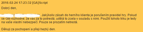 Úprimne mi to vyjadrenie príde dosť na hlavu postavené, zoberte si, že jeden hráč bude za to potrestaný a druhý hráč za rovnakú vec bude hrať bez postihu, len preto, lebo každého vybavoval iný GM? dosť neprofesionálny postoj podľa mňa, buď to povoliť úplne alebo to úplne zakázať, ale nie to nechávať takto na náhodu, že podla toho akého GM chytíš..Ale inak som proti banovaniu za toto, ako teraz vážne Cepino máš dosť úbohé argumenty a ešte ten tvoj s tou bankou bol fakt úplná hovadina z cesty..porovnávať vykradnutie banky,kde niekoho okrádaš s tým, že odstraniš nejaký súbor aby ti nesekala hra, prosímťa to ani nemôžeš myslieť vážne a ak ano, je mi ťa lúto...Nijak tou úpravou neznevýhodňuješ nikoho, nikomu tým neubližuješ a jediné čo to spraví je že ti zmiznú lagy vo swampe, to je asi tak na trest smrti podla teba, že?