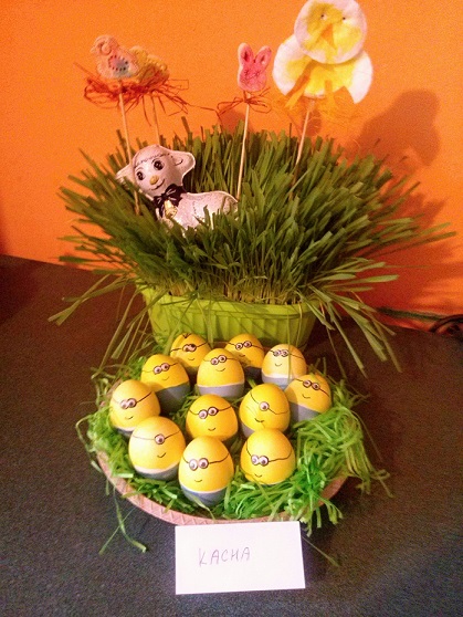 Dětmi zasazená a nazdobená travička a trošku jiná velikonoční vajíčka.