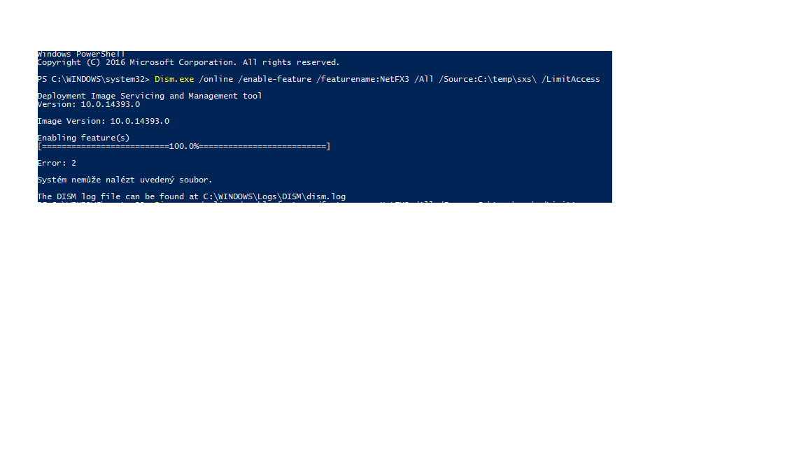 Dism.exe /online /enable-feature /featurename:NetFX3 /All /Source:C:\temp\sxs\ /LimitAccess - Po dokončení by měl být .NET Framework 3.5 úspěšně nainstalován.
