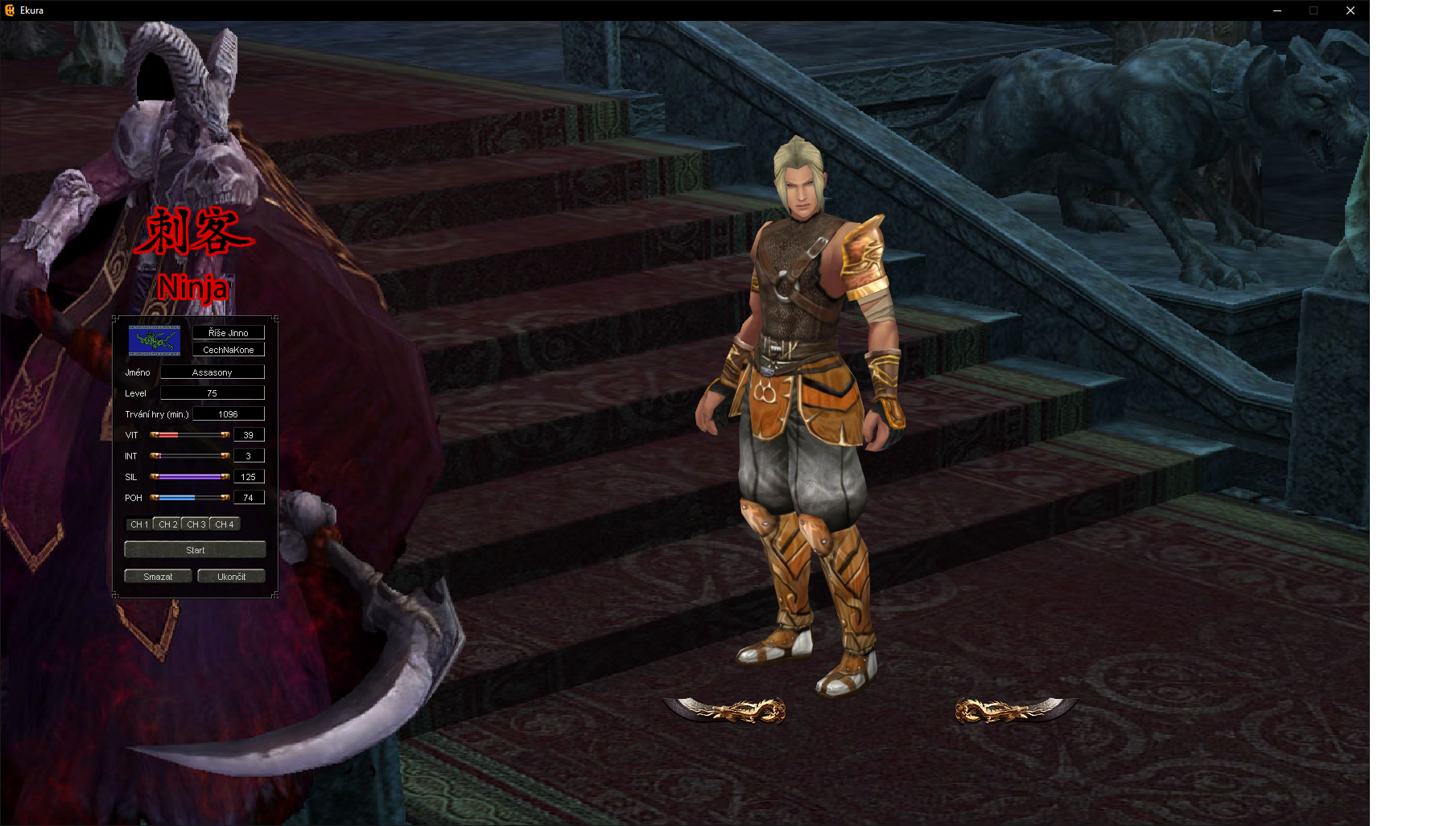 Hlavní postava: Rozhodl jsem se udělat si hlavní postavu ninju. Momentálně je lvl 75, dělá biologa, zručnost, koně a jinak stojí u zahrádky.