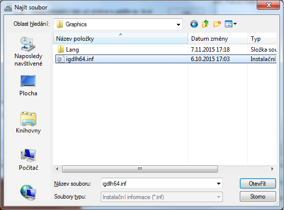 9. Najdeme složku s rozbaleným ovladači z kroku 3, zde vybereme podsložku "Graphics" a poklikáme na soubor igdlh64.inf