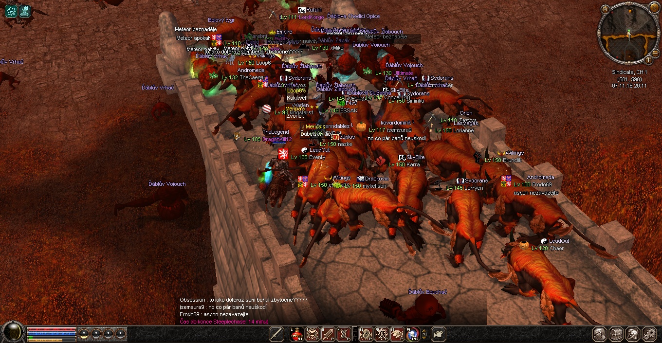 Poté jsem doběla k dalšímu mostu a tam už byl tedy problém velký :lol:. Chvilku jsem kličkovala mezi bossy a pozorovala situaci na mostě, jak se mnozí marně snaží proběhnout a umírají vinou někoho jiného nebo vyvolaných příšer. Tady to nešlo a tak jsem běžela okolo vstupu do rokle. Po cestě již na druhé straně k dalšímu mostu byla další spousta meteorů, mobek a především bossů a musím říct, že ze sedmi běžících Králů Plamenů za mnou jsem měla bobky :) - jsou přeci jen rychlejší.