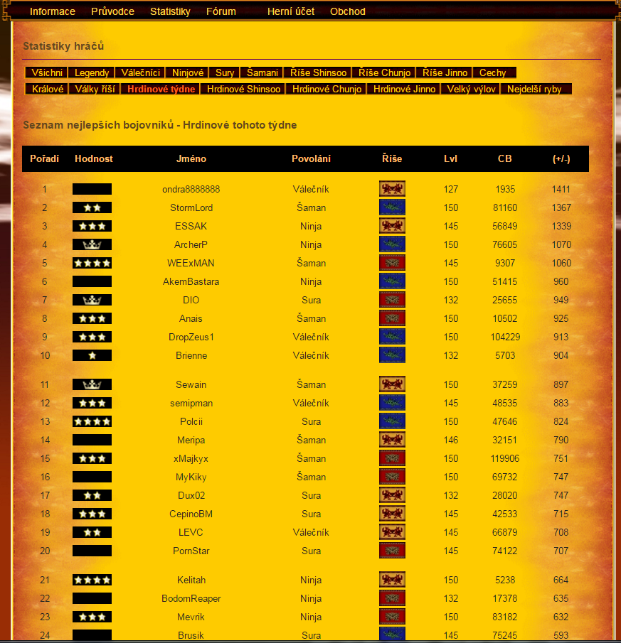 ovechkin píše:Vidím v tvé přiloze u ondry 1935 CB. A když teď kouknu na web, tak tam má 1952. Což je nárůst 17 CB. Takže někde získal i po válce :D Bude asi hodně zajímavé pořídit screen statistik hrdinů říší v úterý před válkou v 18.55 a poté v 20.05. Kolik tento udatný bojovník udělá CB za válku a kolik zákeřně na pvmkách v Cido :D :fight: