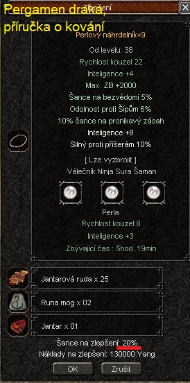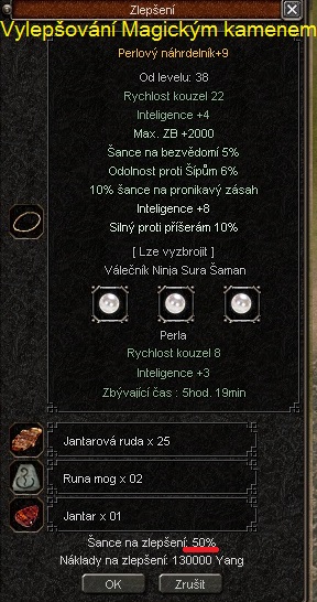 Ahoj, základní šance vylepšení Perlového náhrdelníku na +9 je 50%. Pomocí Pergamenu draka a Příručky o kování vylepšuješ jakýkoliv předmět na +9 s 20% šancí. Zaráží mě ale šance na vylepšení Magickým kamenem, ta by měla být 45% (-5%).
