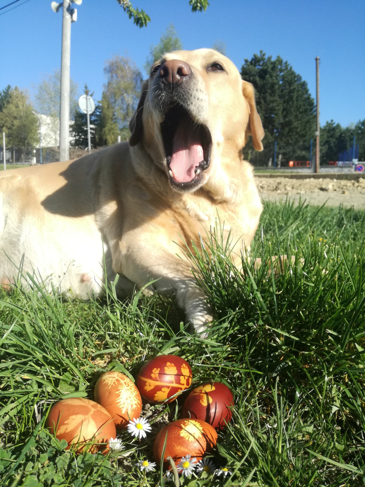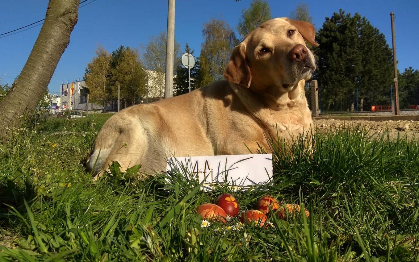 Vajíčka bych letos nebarvila, ale jeden milý mladý muž si řekl za odvoz formou spolujízdy velikonoční vajíčko :D A tak jsem jich pár udělala. Řidič byl překvapen :) K focení venku se mi pletla Sárinka, tak jsem vajíčka zvěčnila spolu s ní.