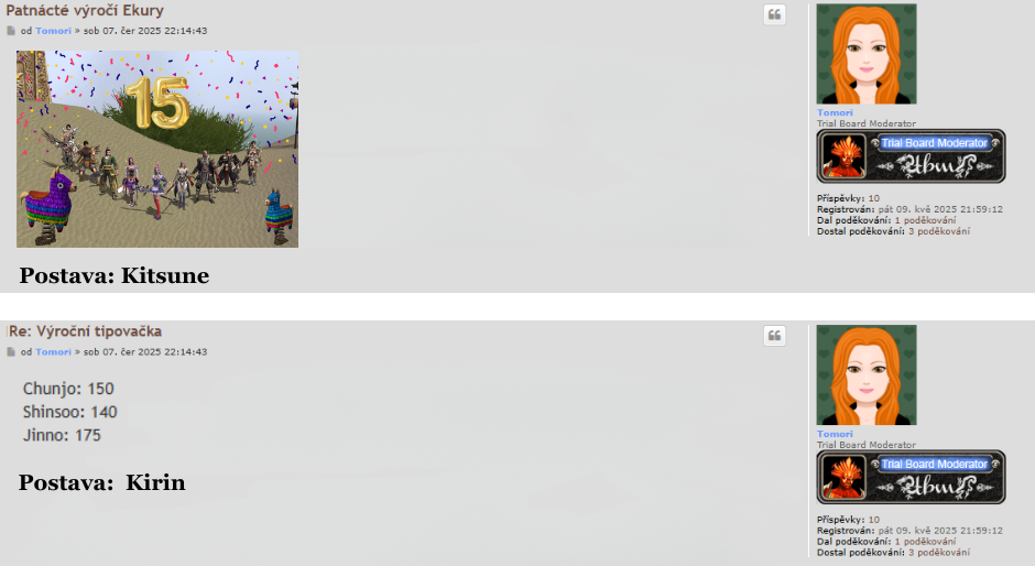 Všechny hráče, kteří ve svém soutěžním příspěvku (v tipovačce či přáníčku) neuvedli jméno postavy, na kterou si přejí část amuletu připsat, aby jej co nejdříve doplnili - a to buď úpravou svého příspěvku, nebo formou soukromé zprávy přímo na Tomori zde na fóru.